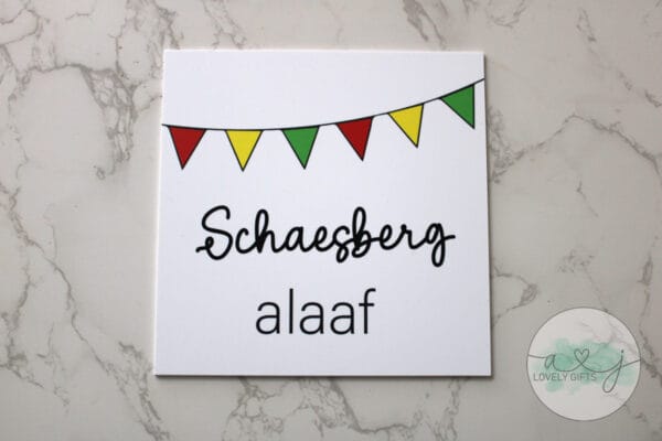 LET OP: de tegel zelf is bedrukt met vlaggen en alaaf.De losse plaatsnaam maken we zelf van zwarte vinyl sticker zodat we elke plaatsnaam kunnen maken.