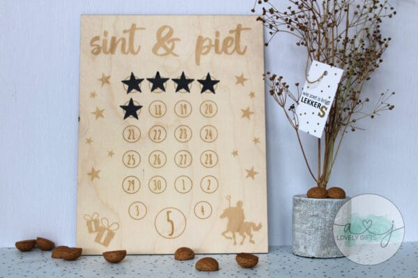 Deze aftelkalender is gemaakt van hout en wordt geleverd met 25 stickers om elke dag af te tellen dat pakjesavond eraan komt.